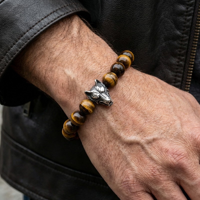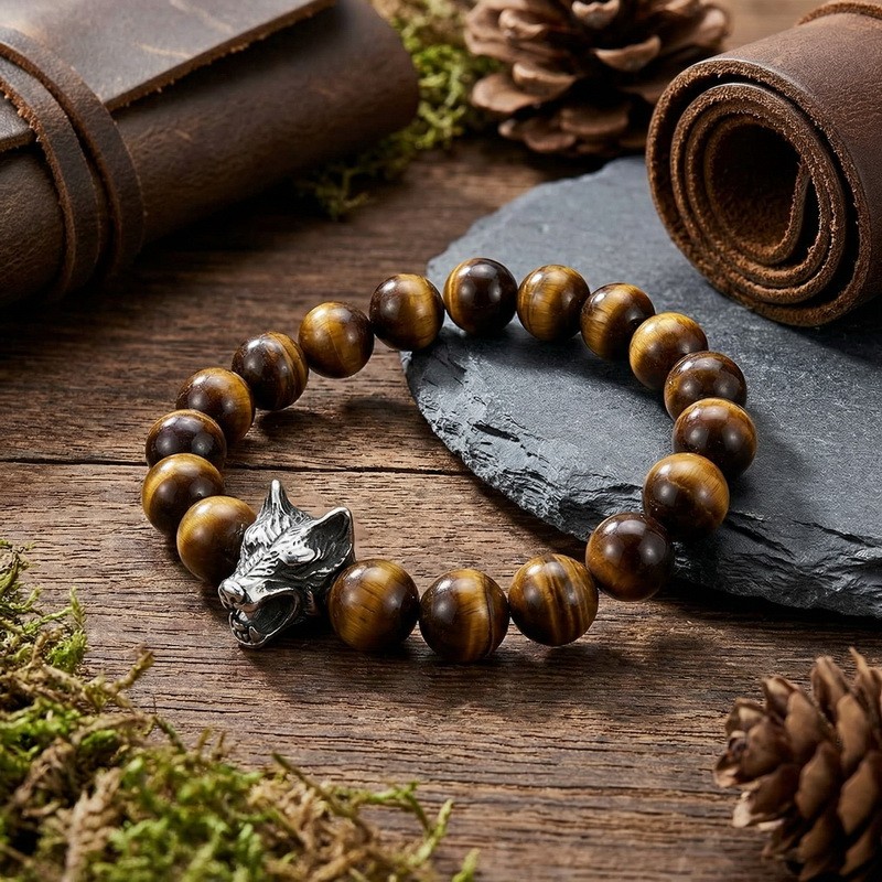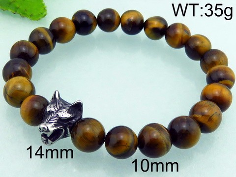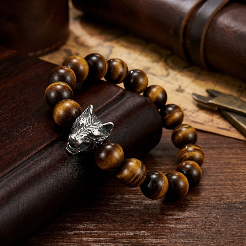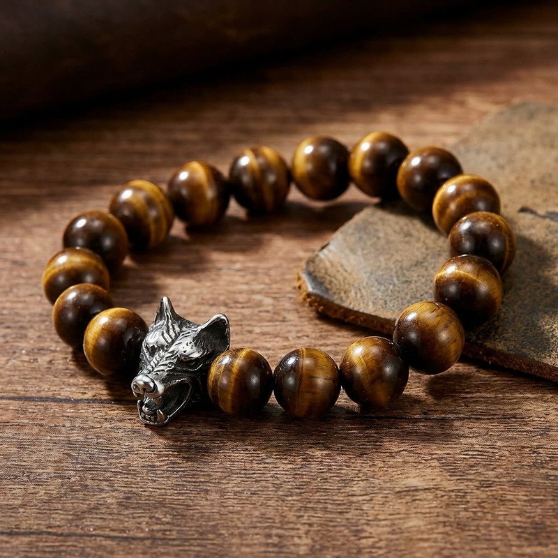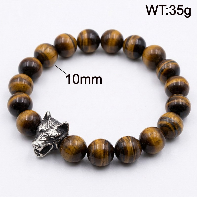 - Stainless steel cast wolf head with round bead bracelet