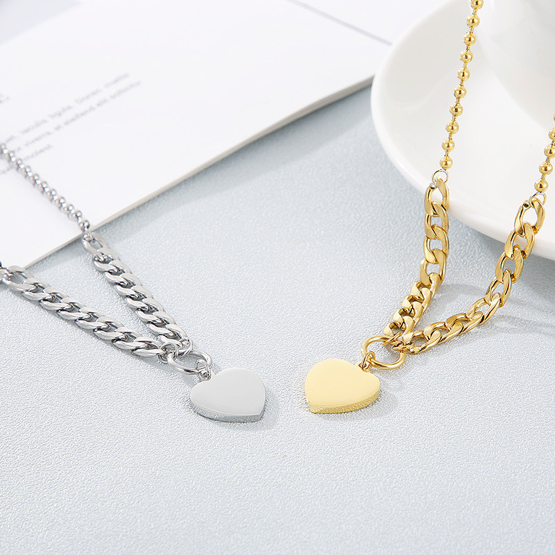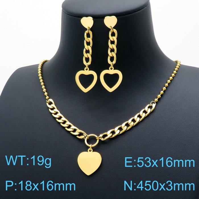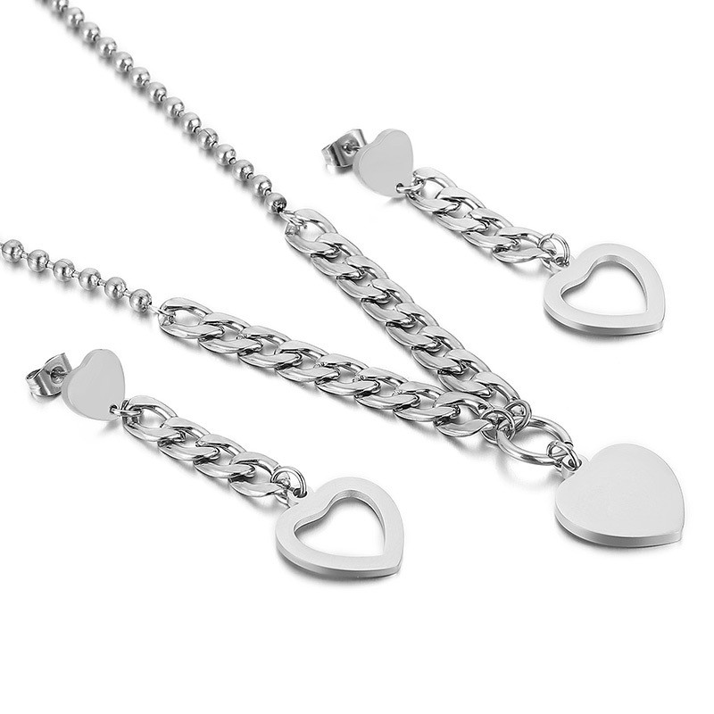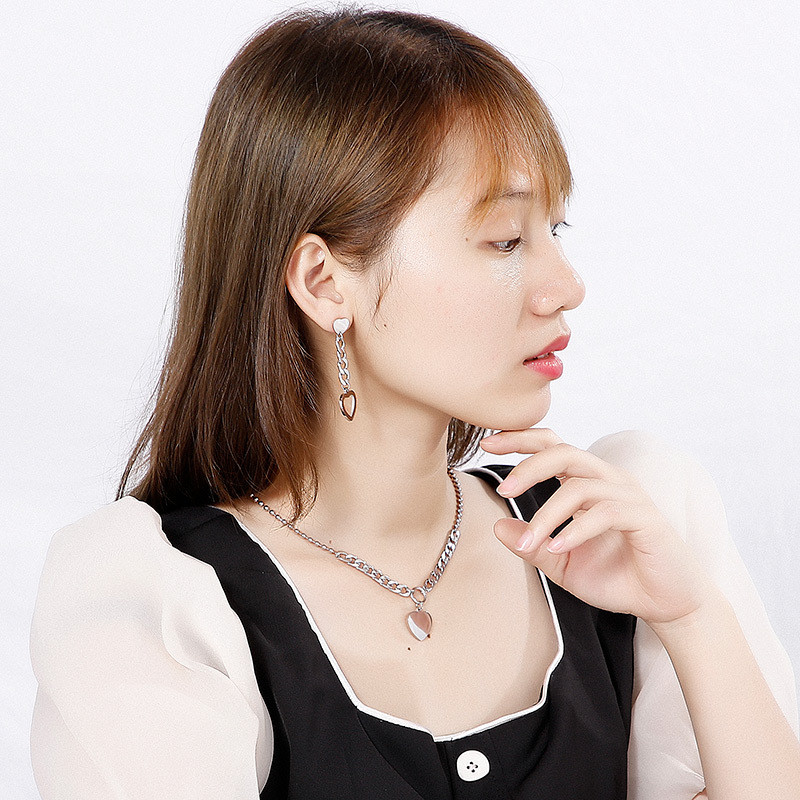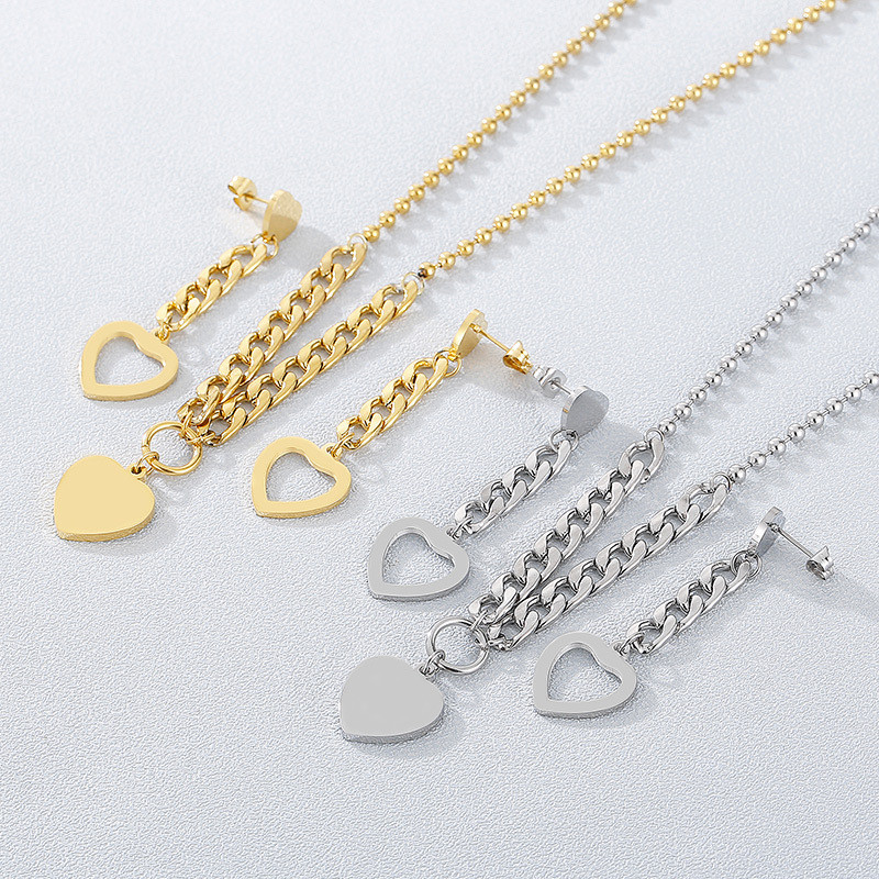 - Simple stainless steel heart-shaped earrings necklace chain bead chain set