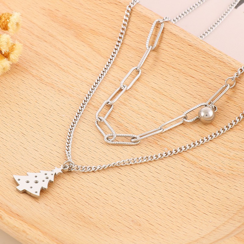 Women Gold-Plated Stainless Steel Double Style Chains Necklace with Cartoon Bell&Christmas Tree Pendants