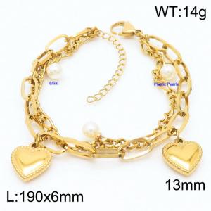 - Double Layer Chains Heart 6mm Pearl Bracelet 18K Gold Plated Stainless Steel Couple Bracelets