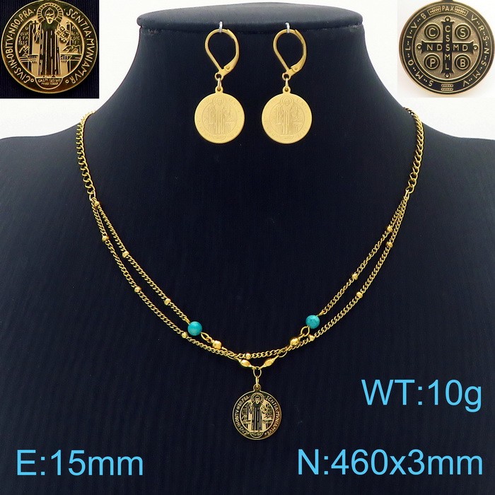 Stainless steel 460 × 3mm Long Chain Fashion Blue Beads Round Cross Pattern Pendant Earrings Charm Gold Set
