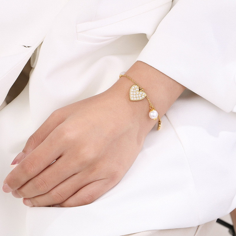 Light weight Silver Stainless Steel Heart Charm Bracelet With Shell Beads & Cubic Zirconia Adjustable SizeWholesale Price: