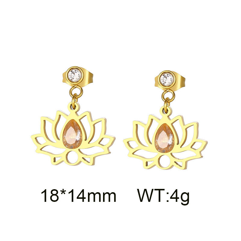 Stainless steel fashionable gilded earrings hanging hollow lotus shaped pink gemstone pendantWholesale Price: