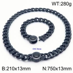 Black 13mm Cuban Link Necklace & Bracelet Set With CNC Stones - 75cm Necklace × 21cm Bracelet Versatile and Trendy Stainless Steel JewelryWholesale Price: