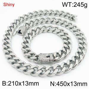 Simple and stylish polished stainless steel 13mm diamond studded buckle Cuban bracelet necklace set