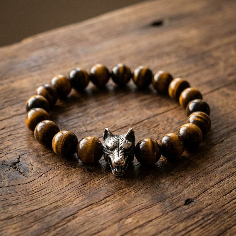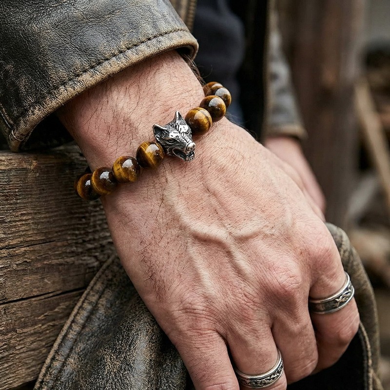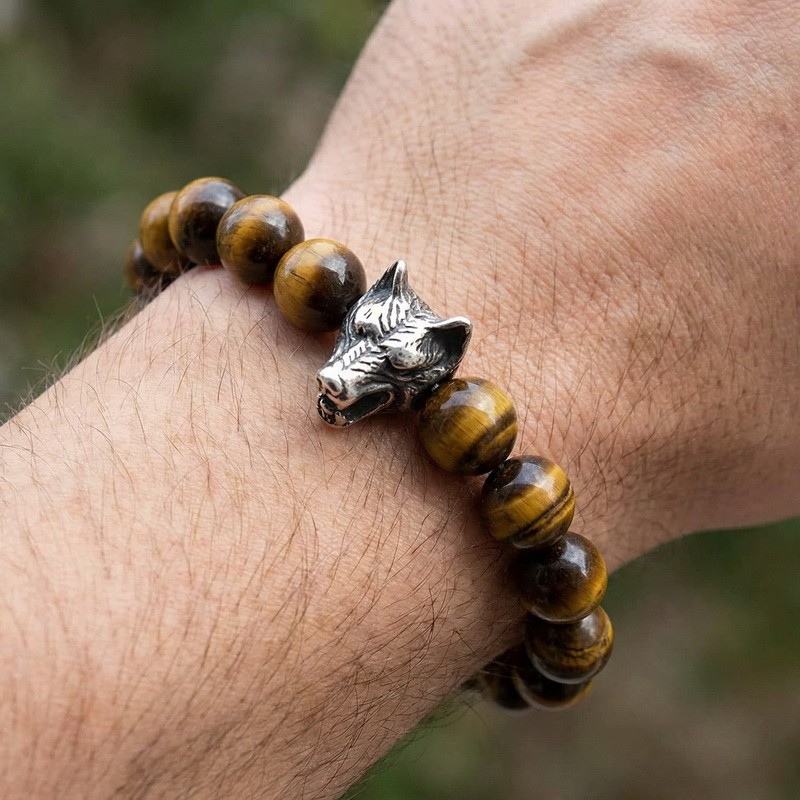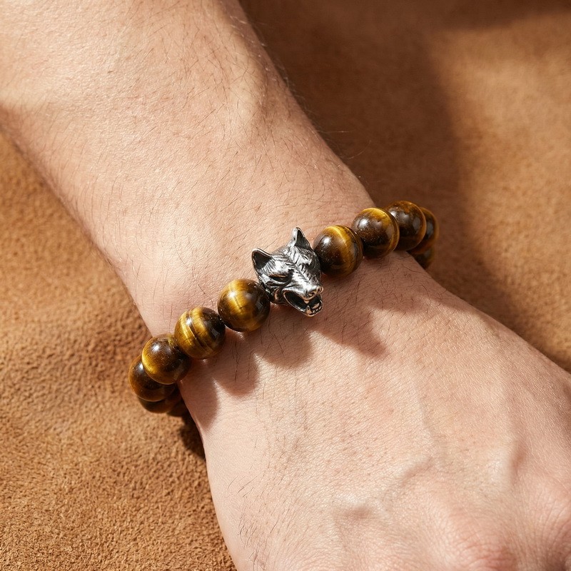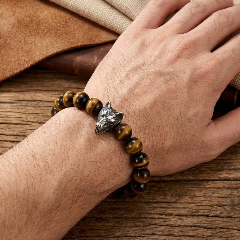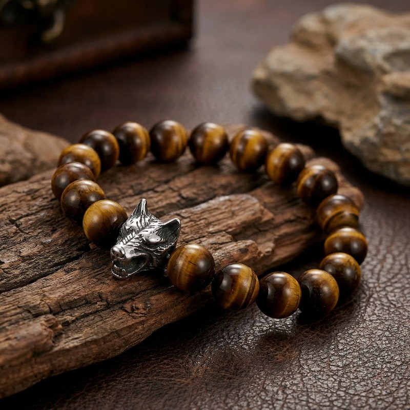 - Stainless steel cast wolf head with round bead bracelet