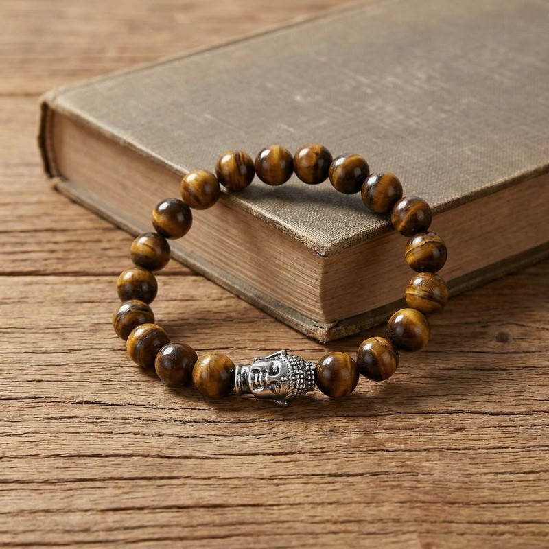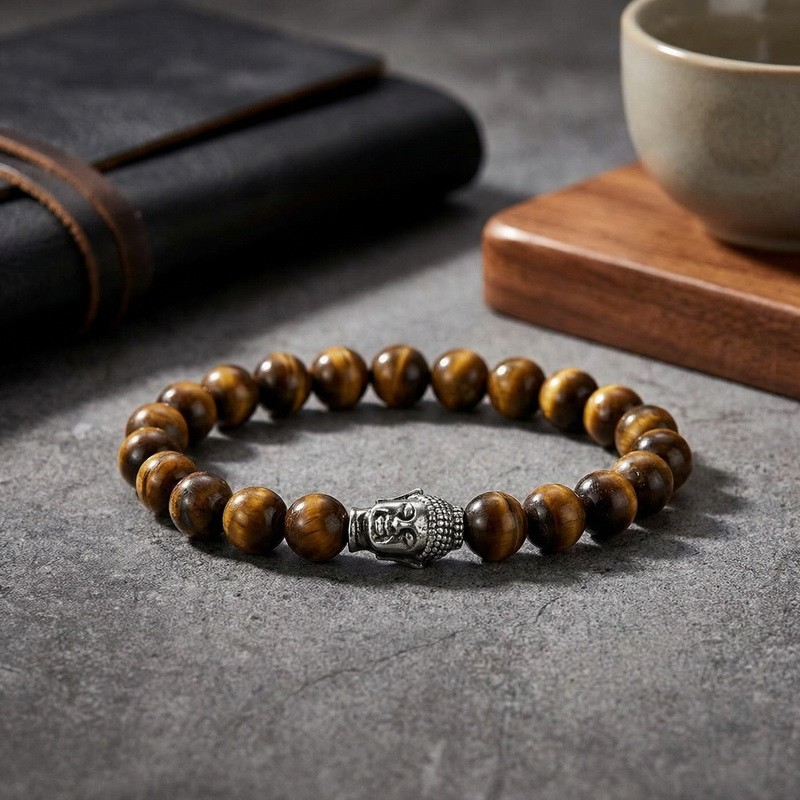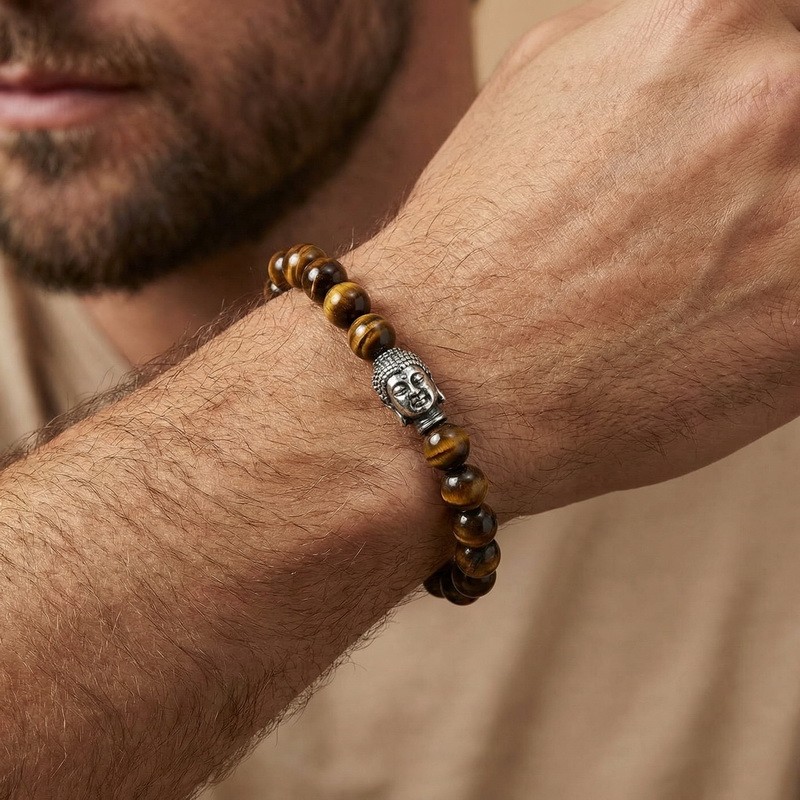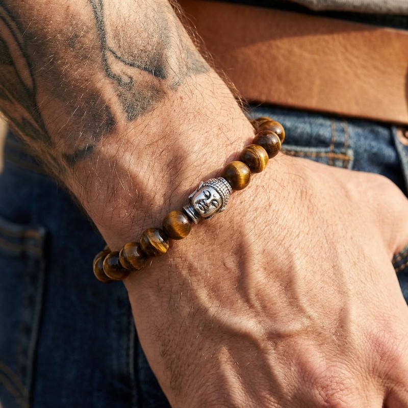 - Stainless steel cast Buddha head paired with bead bracelet